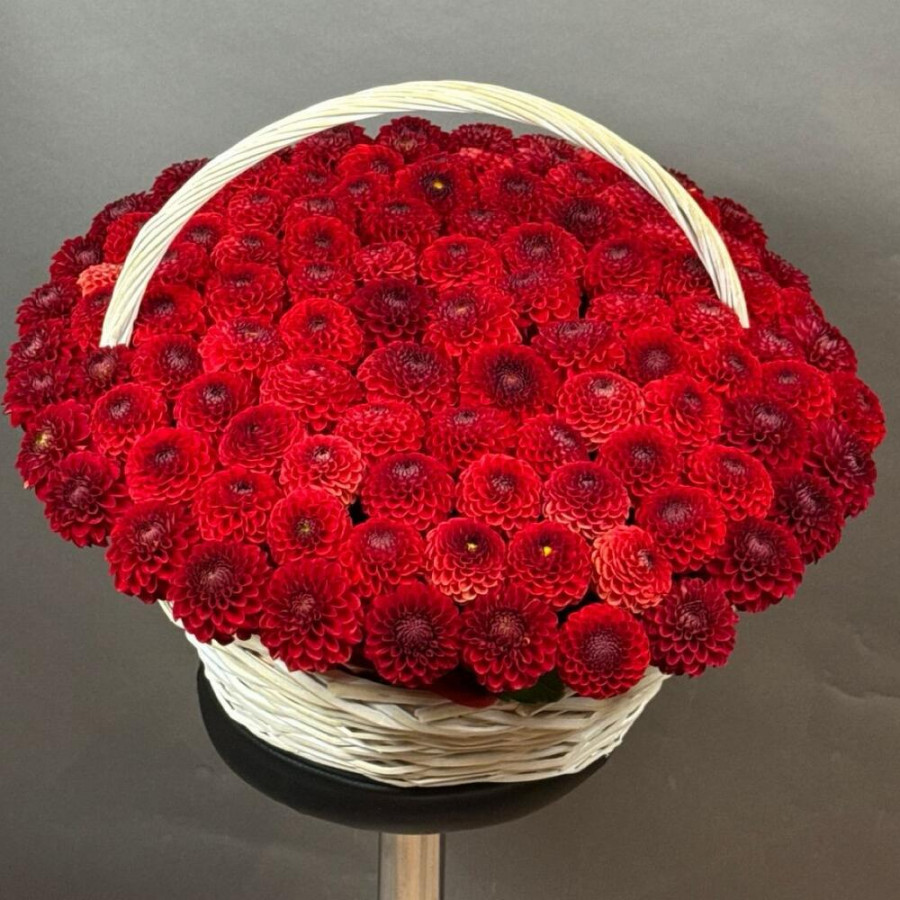 На фото композиция из 101 красной георгины в корзине. В составе: георгина 101 шт, оазис флористический 7 шт, корзина (xl) 1 шт, атласная лента 2 шт, . Все цветы свежие и ароматные, букет красиво оформлен и отлично подходит для подарка. Доступна доставка цветов или самовывоз.