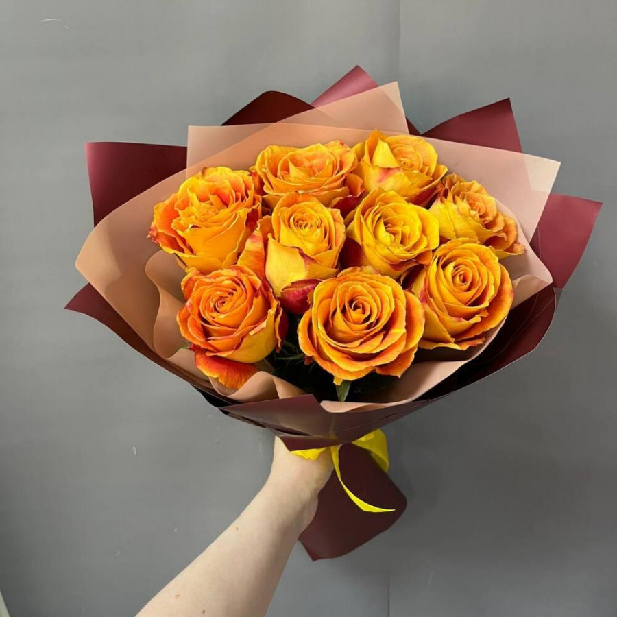 На фото букет из 9 оранжевых роз. В составе: роза 9 шт, дизайнерская упаковка 2 шт, атласная лента 1 шт, . Все цветы свежие и ароматные, букет красиво оформлен и отлично подходит для подарка. Доступна доставка цветов или самовывоз.