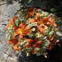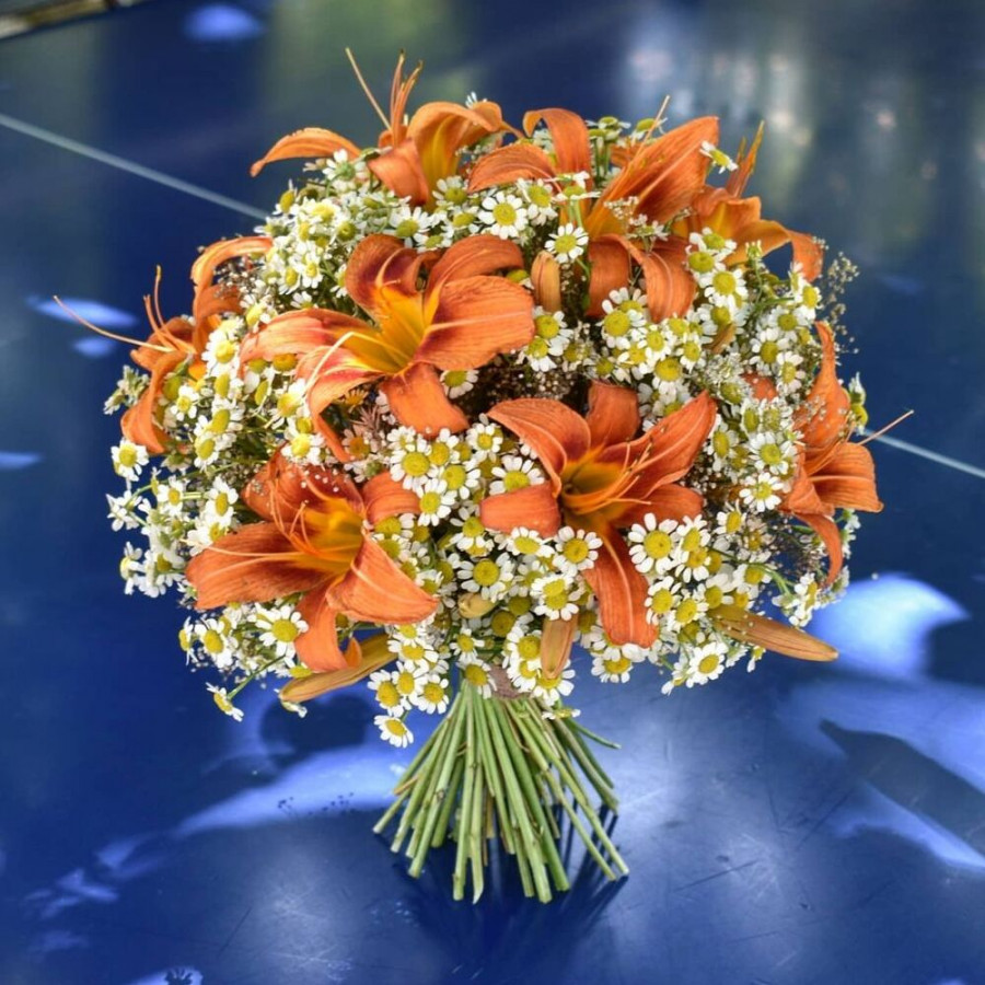 На фото букет из лилий и ромашек. В составе: лилия 11 шт, танацетум 9 шт, атласная лента 1 шт, . Все цветы свежие и ароматные, букет красиво оформлен и отлично подходит для подарка. Доступна доставка цветов или самовывоз.