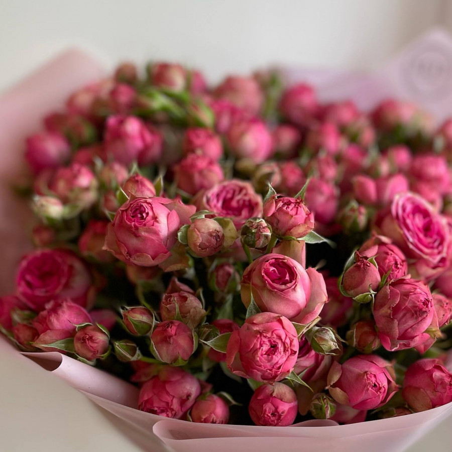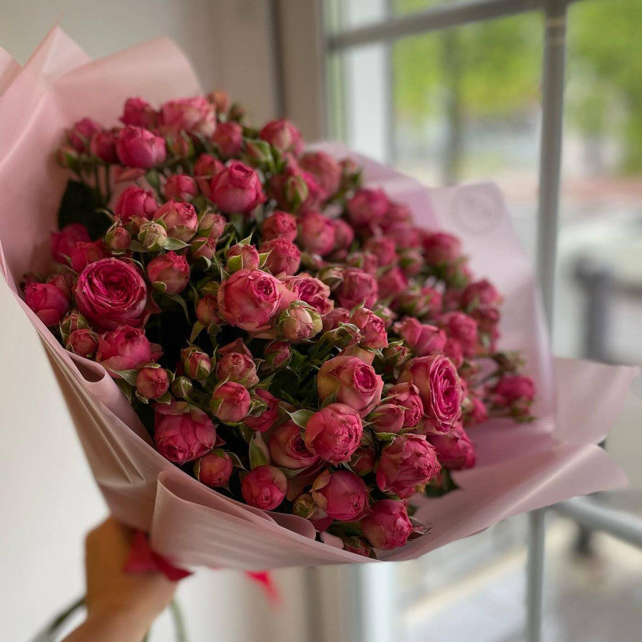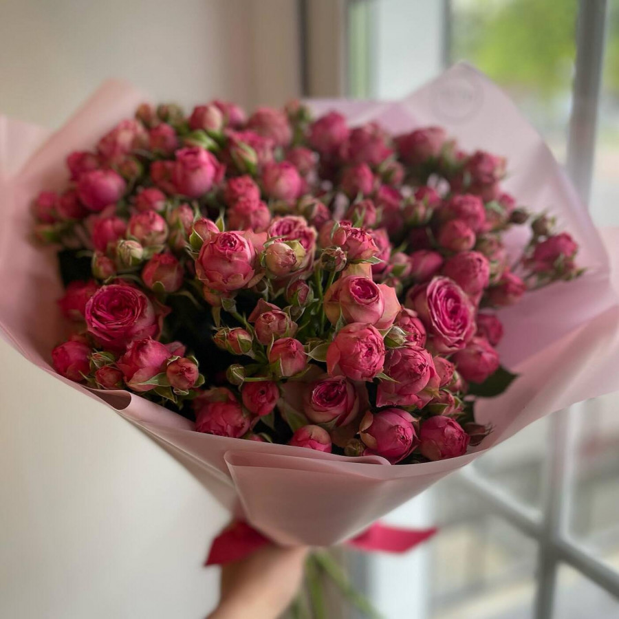 На фото монобукет из розовой кустовой розы. В составе: кустовая роза 13 шт, крафт-бумага 1 шт, атласная лента 1 шт, . Все цветы свежие и ароматные, букет красиво оформлен и отлично подходит для подарка. Доступна доставка цветов или самовывоз.